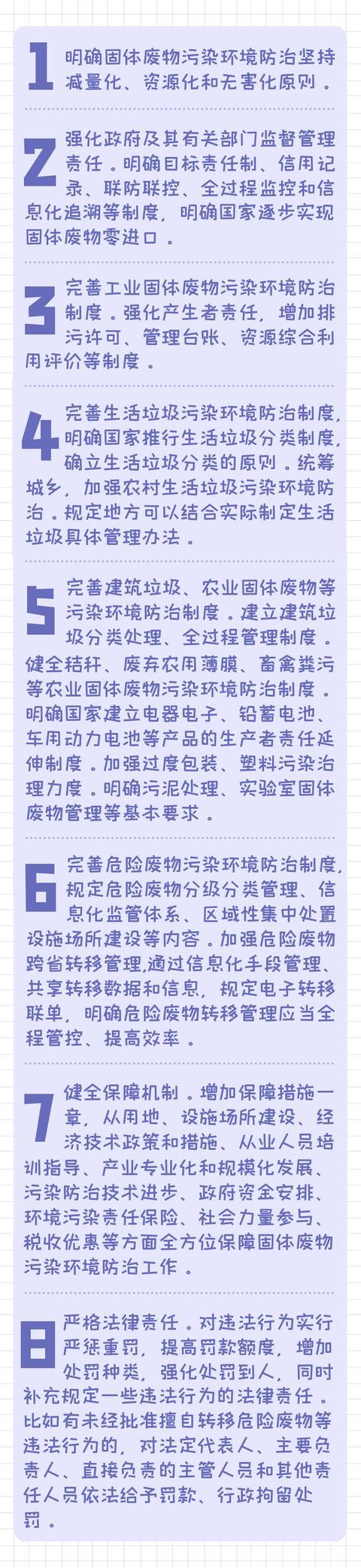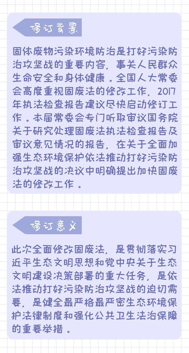 此次修改固廢法,堅持以人民為中心的發(fā)展思想,貫徹新發(fā)展理念,突出問題導向,總結實踐經(jīng)驗,回應人民群眾期待和實踐需求,健全固體廢物污染環(huán)境防治長效機制,用最嚴格制度最嚴密法治保護生態(tài)環(huán)境。