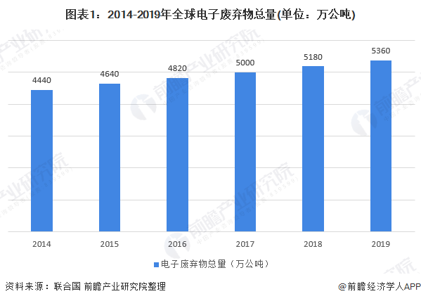 2014-2019年,全球電子廢棄物總量不斷增加。《2020年全球電子廢棄物監(jiān)測》報告顯示,2019年全球產(chǎn)生的電子廢棄物(帶電池或插頭的廢棄產(chǎn)品)總量達到了創(chuàng)紀錄的5360萬公噸。